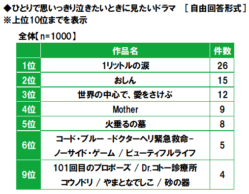 ■ひとりで思いっきり泣きたいときに見たいドラマ 1位「1リットルの涙」2位「おしん」