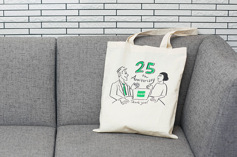 10月31日(土)までの期間で、ラーニングスタジオにて無料体験レッスンにお越しいただいた方にプレゼントいたします。広告、雑誌などで活躍されている人気イラストレーター佐伯 ゆう子さんが描き下ろしたGaba25周年記念オリジナルトートバッグです。
